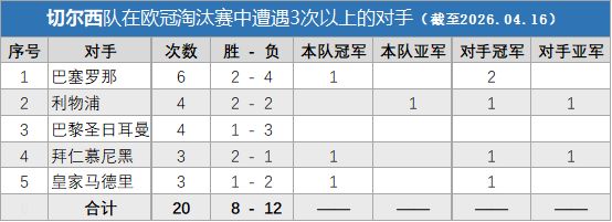 巴黎圣日耳曼:有3个对手:巴塞罗那、切尔西和拜仁慕尼黑,对战成绩详见前文各对手的内容。